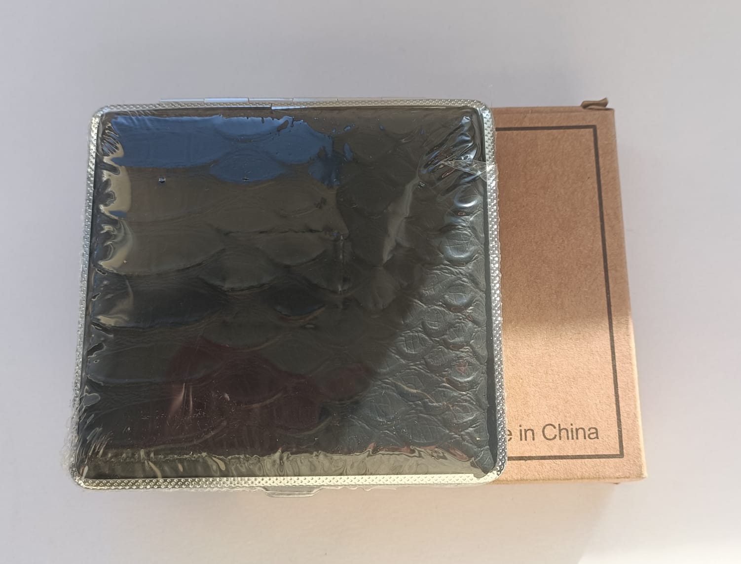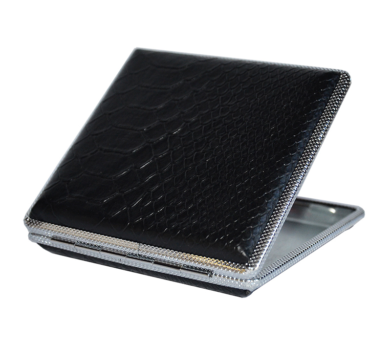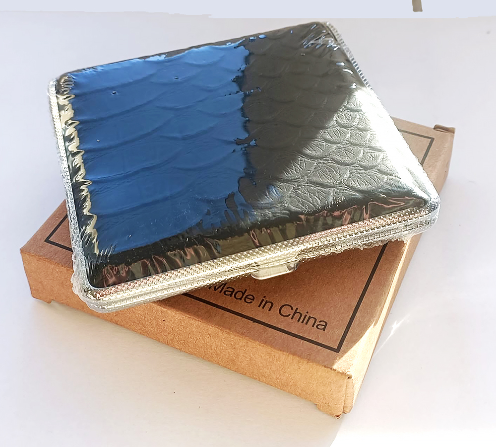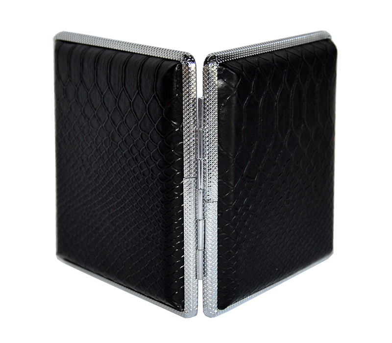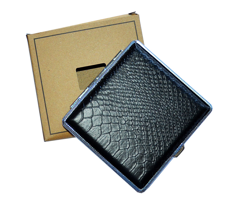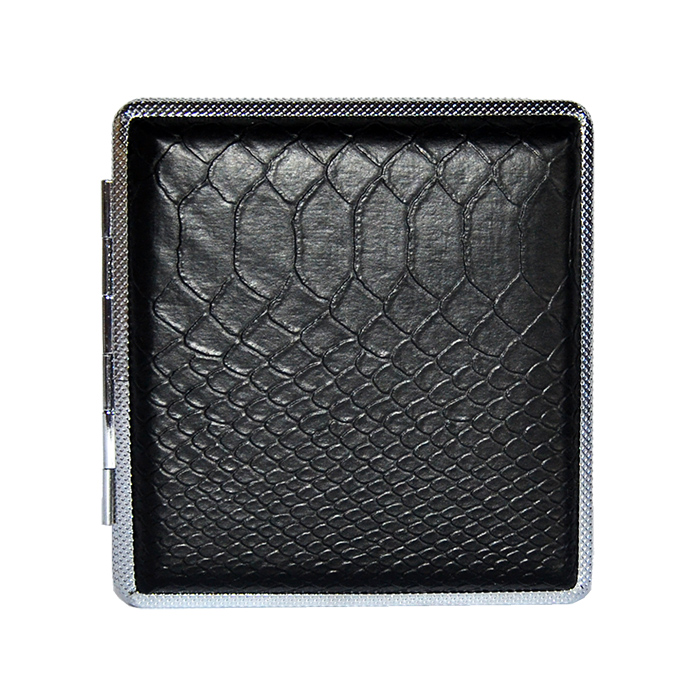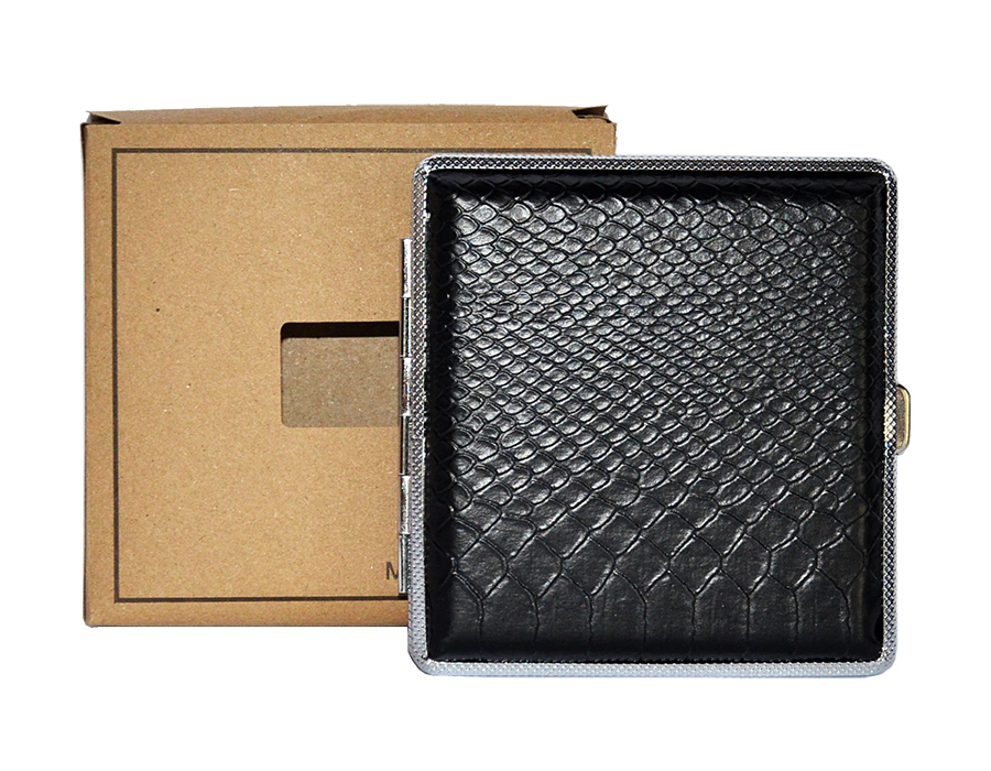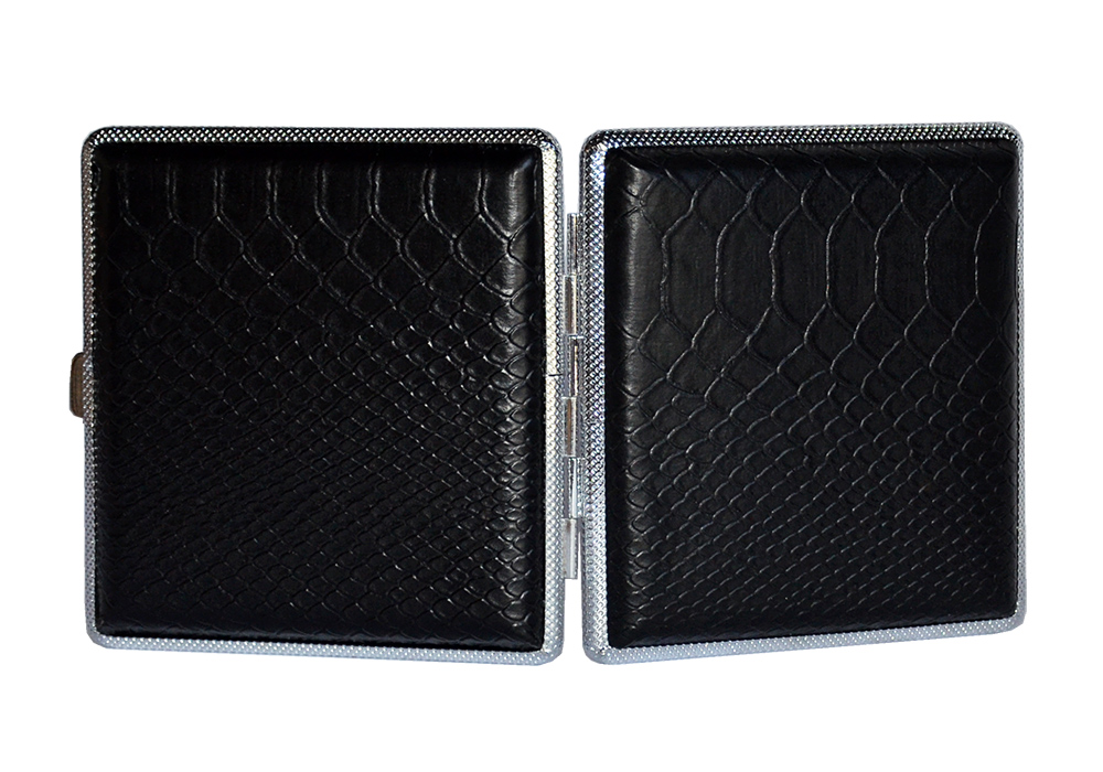 Papierośnica czarna ala kroco - model bardzo elegancki, wykonany z metalu o powierzchni szczotkowanej, natomiast na wierzchniej stronie pokryty materiałem imitującym skórę kroko.