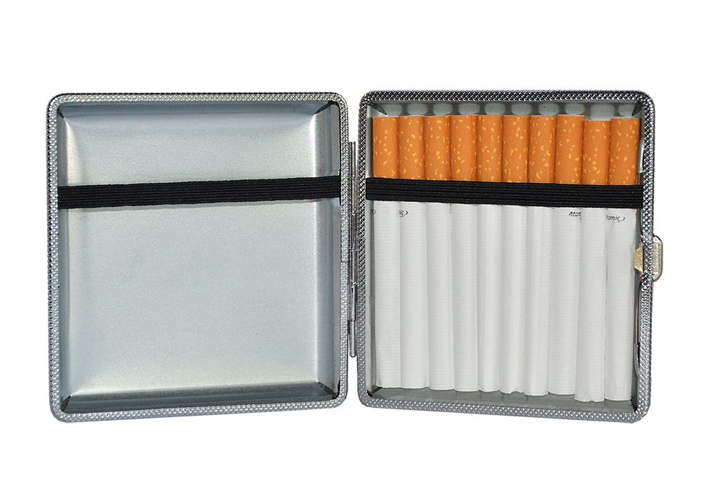 W środku umieszczone zostały gumki do przytrzymywania papierosów, których zmieści się około 18 sztuk. Papierośnica jest zapakowana w biały kartonik z okienkiem, idealnie sprawdzi się jako drobny prezent, upominek.