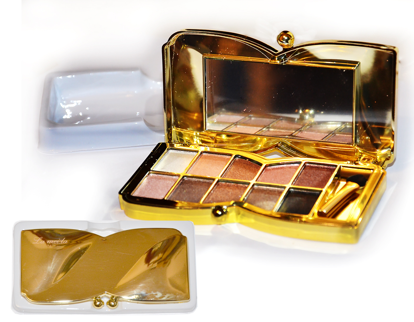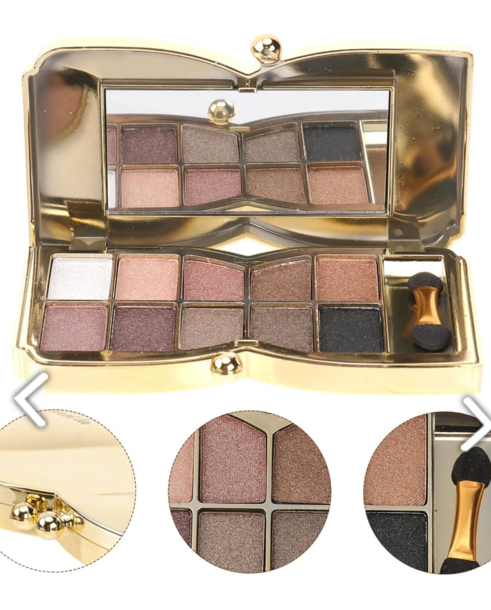 Paleta wyposażona jest w lusterko oraz dwustronny aplikator. Stylowe, złote opakowanie sprawia, że produkt prezentuje się estetycznie i jest wygodny w użytkowaniu.