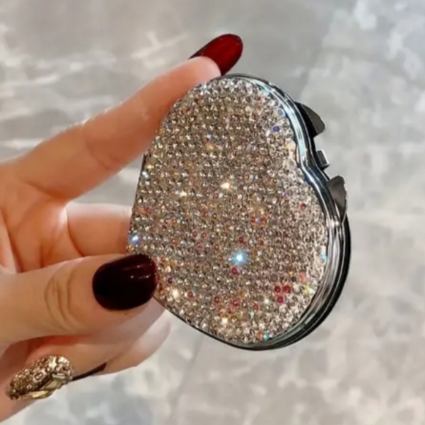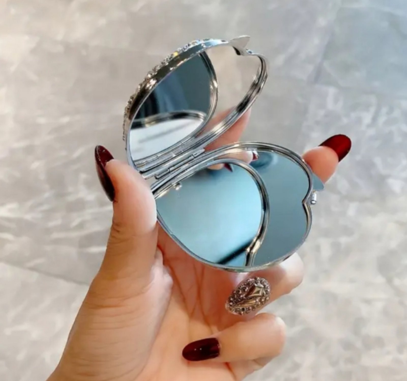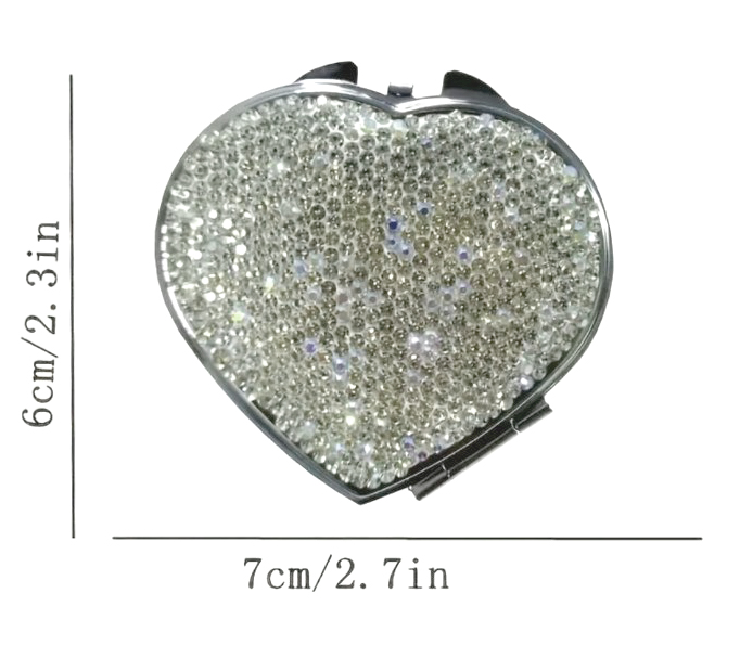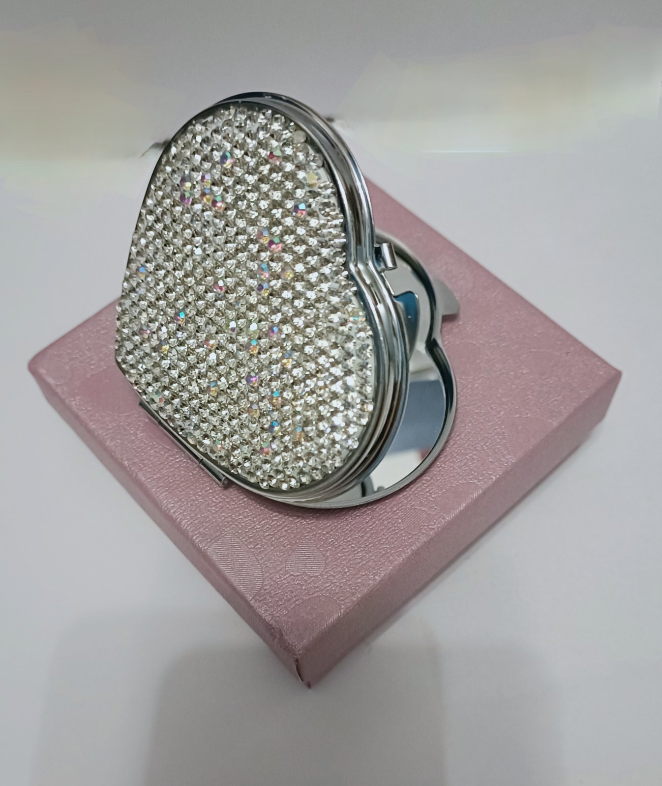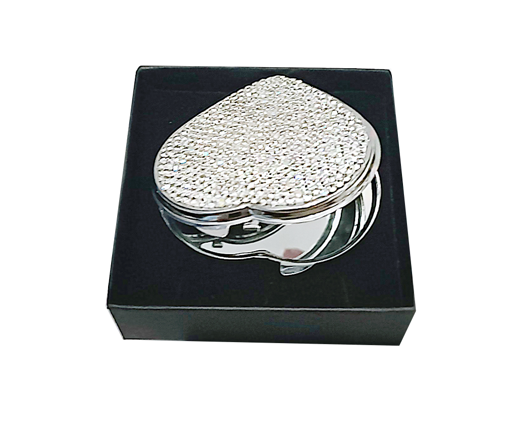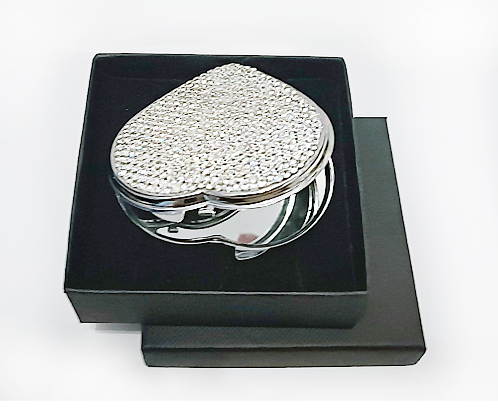 Eleganckie lusterko kieszonkowe w kształcie serca, metalowe, wysokiej klasy, luksusowe i stylowe – idealne do makijażu w podróży. Starannie ozdobione białymi, bardzo błyszczącymi kryształkami i cyrkoniami ze szkła bohemskiego, które dodają mu wyjątkowego blasku.Bardzo ładne zamykane lusterko kieszonkowe zdobione cyrkoniami. Wewnątrz znajdują się dwa lusterka - jedno z lekkim powiększeniem, a drugie bez powiększenia. Średnica: 7 cm. Lusterko ma solidny zawias, który umożliwia ustawienie go pod dowolnym kątem a także rozłożenie go na płasko.