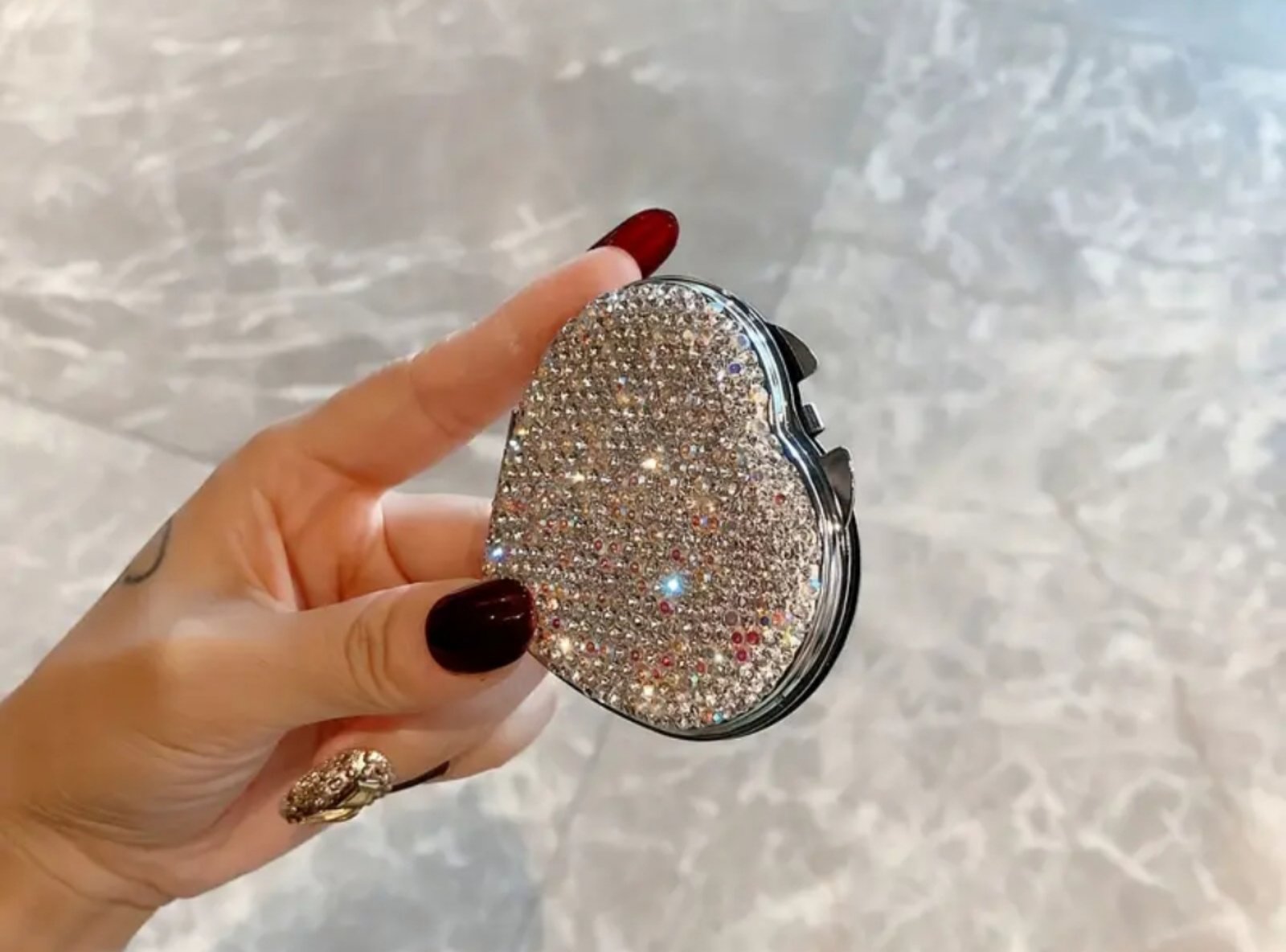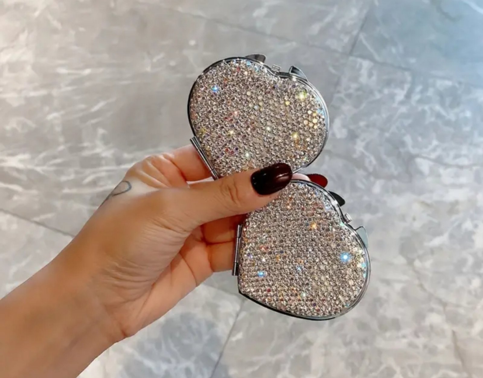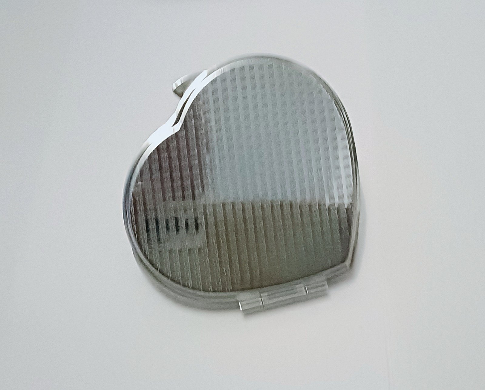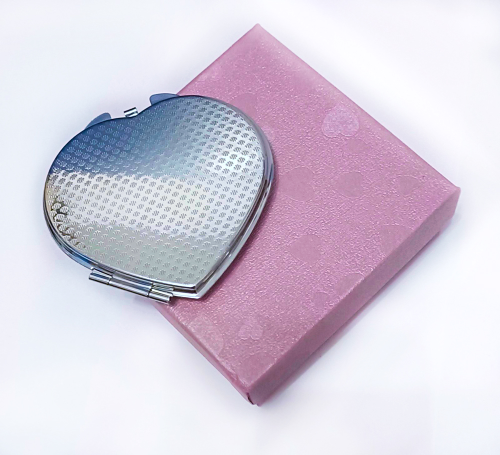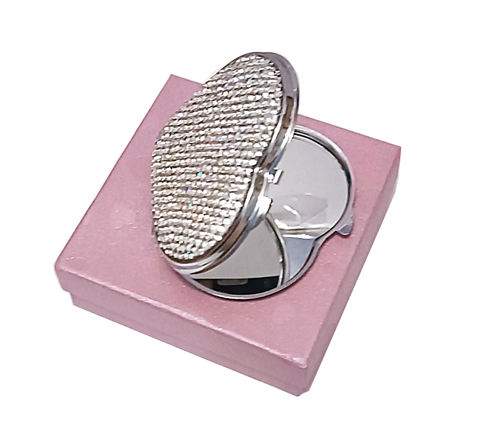 Eleganckie lusterko kieszonkowe w kształcie serca, metalowe, wysokiej klasy, luksusowe i stylowe – idealne do makijażu w podróży. Starannie ozdobione białymi, bardzo błyszczącymi kryształkami i cyrkoniami ze szkła bohemskiego, które dodają mu wyjątkowego blasku.Bardzo ładne zamykane lusterko kieszonkowe zdobione cyrkoniami. Wewnątrz znajdują się dwa lusterka - jedno z lekkim powiększeniem, a drugie bez powiększenia. Średnica: 7 cm. Lusterko ma solidny zawias, który umożliwia ustawienie go pod dowolnym kątem a także rozłożenie go na płasko.